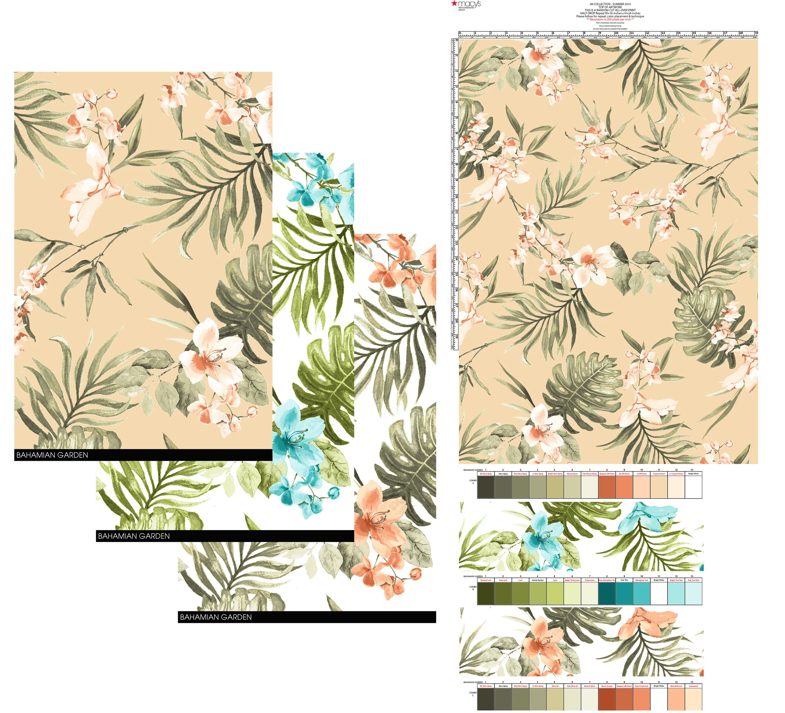 These two are part of the same collection aiming for a sun-washed summer look. Painted tropical print actualized digitally in multiple colorways.