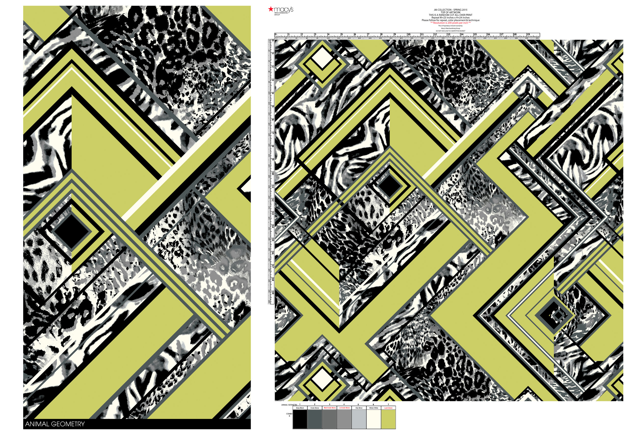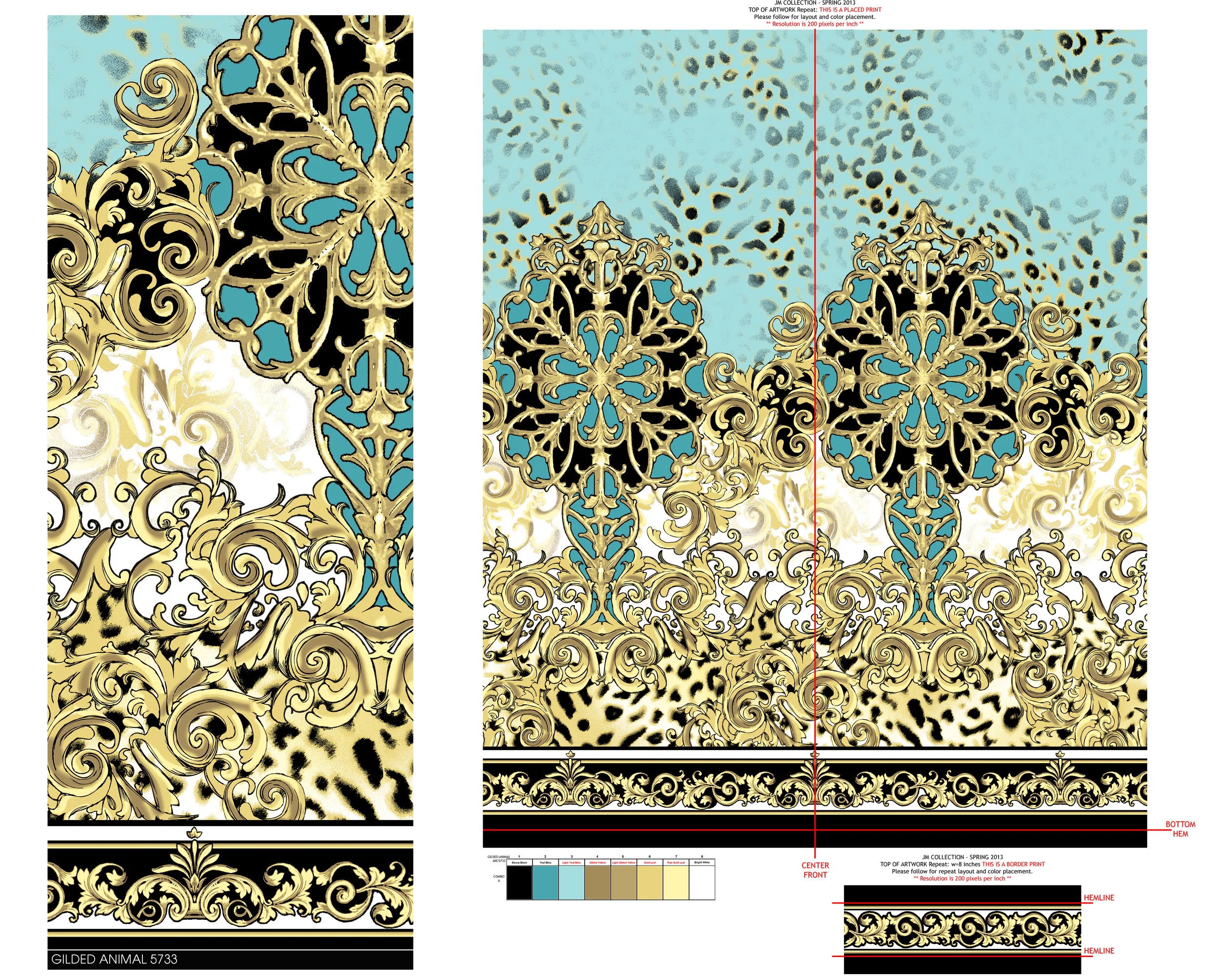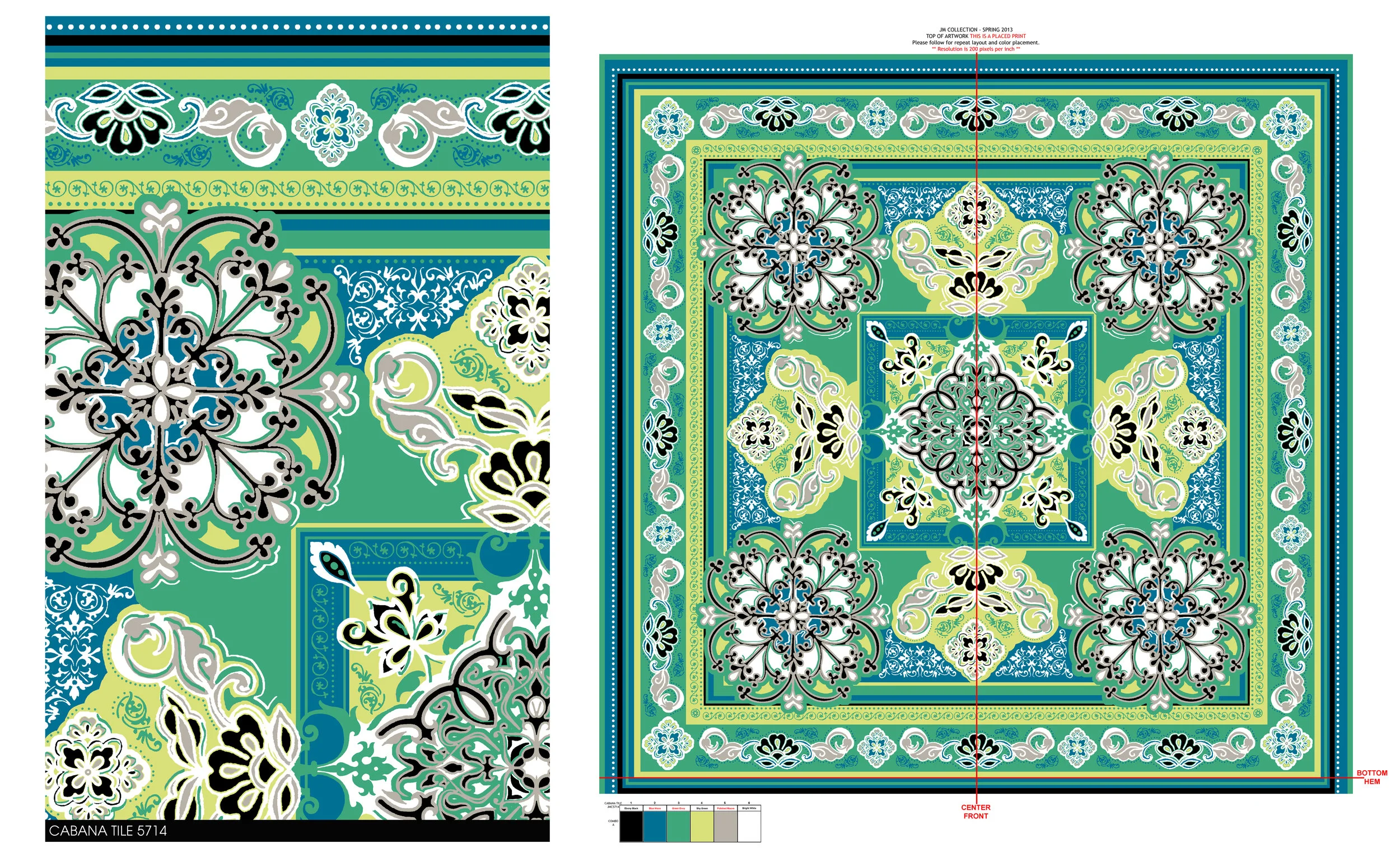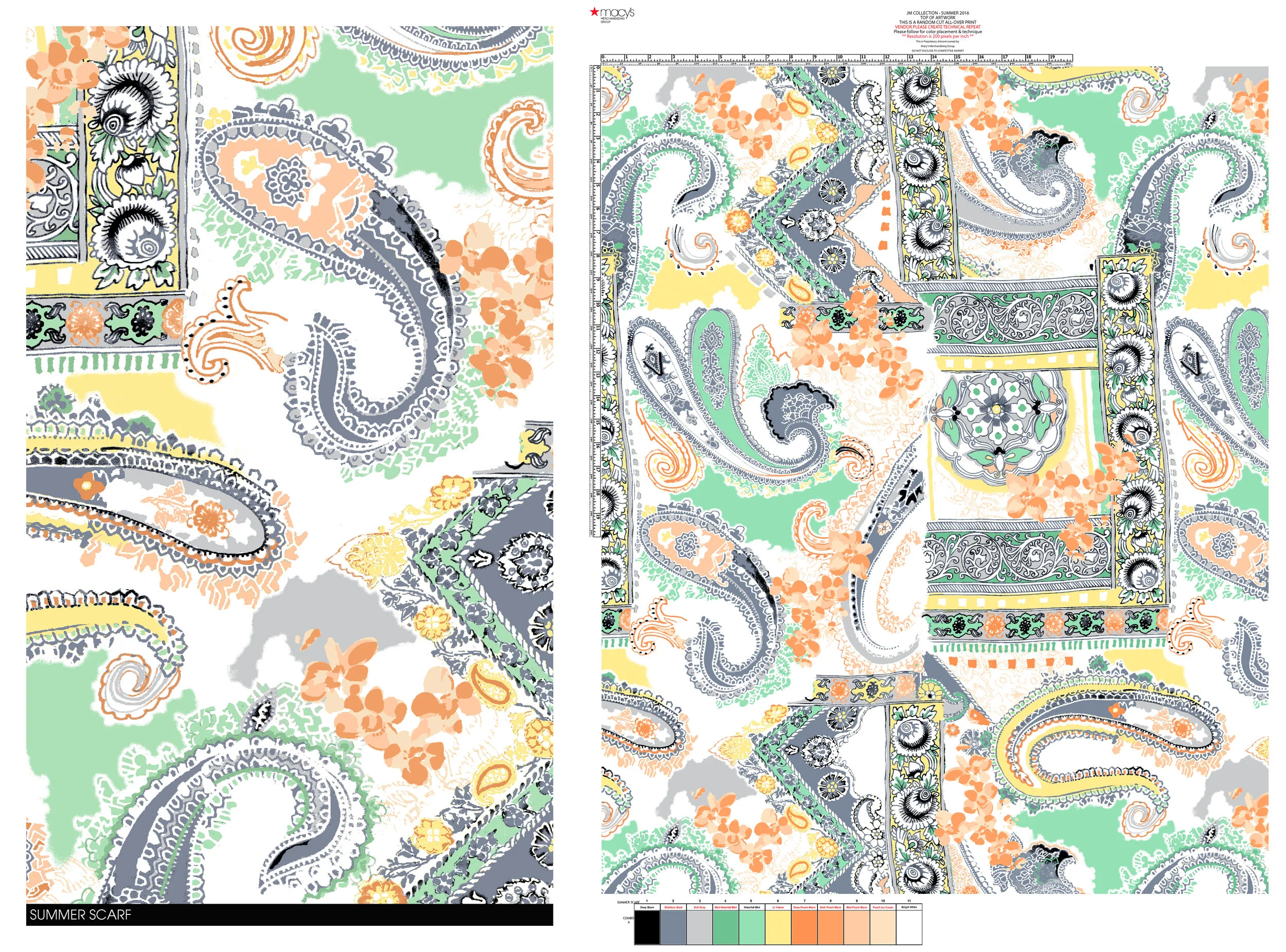 Runway inspired saturated scarf placement created entirely digitally with great attention to detail in both motif balance and color balance.